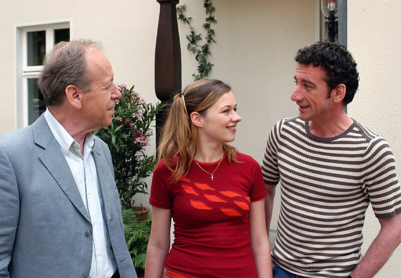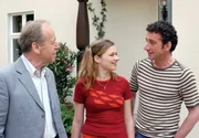 Frank (Heio von Stetten, re.) hat gute Neuigkeiten für seine Tochter Franzi (Kathrin Enenkel) und Schwiegervater Georg (Rüdiger Vogler).Bild: © ARD Degeto/Katrin Knoke