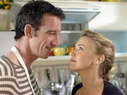 Der Nachwuchskoch Michael (Pascal Andres) erklärt der ratlosen Marlene (Tina Ruland), wie man Schnitzel zubereitet: schneiden, klopfen, panieren, braten.Bild: © ARD Degeto/Katrin Knoke