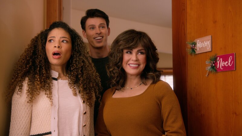 Amanda Payton as Sawyer(l.), Adam Gregory as Landon and Marie Osmond as Margaret. Die Single Frau Sawyer fühlt sich einsam und erstellt aus Langeweile eine Hochzeitsliste. Als ihre Freunde die Liste finden, denken sie, Sawyer hätte sich heimlich verlobt. Anstatt die Wahrheit zu sagen, spinnt sie die Lüge weiter und sucht sich einen "Verlobten" für die Feiertage.Bild: © Happy Wives LLC
