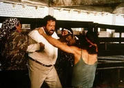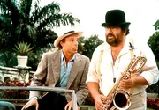 Stuntman Greg Wonder (Terence Hill, li.) und Saxophonspieler Elliot (Bud Spencer) werden von zwei brasilianischen Multimillionären als Doppelgänger angeheuert, da diese von einer Killerbande bedroht werden.Bild: © RTL II