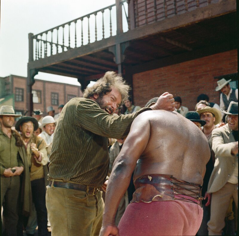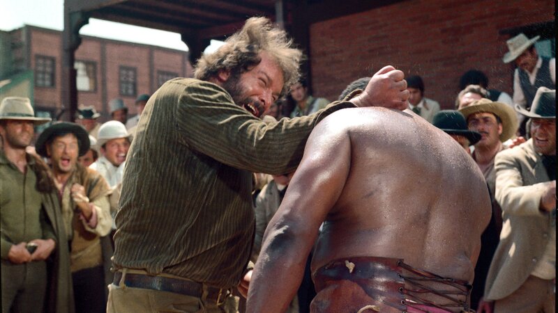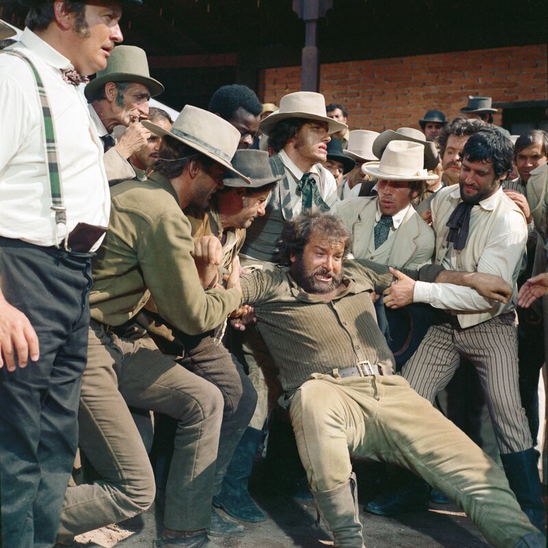 "Die Italowestern-Burleske von Giuseppe Colizzi ist wohl bis heute der beste Film geblieben, in dem der Dicke mit der großen Faust und der schlanke Blauäugige mit dem schnellen Hirn jemals aufgetreten sind", schrieb der "Tagesanzeiger" - dem bleibt wohl nichts mehr hinzuzufügen! / Bud Spencer wurde 1929 als Carlo Pedersoli in Neapel geboren. Die Schauspielerei war nicht die einzige Leidenschaft des "pfundigen" Spencer: Er promovierte in der Jurisprudenz und nahm an den Olympischen Spielen 1952 in Helsinki teil. Dort gewann er sogar eine Silbermedaille - im Schwimmen! / Nachdem sein Sohn 1990 bei einem Verkehrsunfall 27-jährig ums Leben kam, zog sich Terence Hill zunächst völlig aus dem Filmgeschehen zurück. In den 90er Jahren wirkte er lediglich in zwei Filmen mit, doch 2000 startete er ein Comeback mit der überaus beliebten italienischen Serie "Don Matteo", in der er die Titelrolle eines Pfarrers spielt, der mit Witz und kriminalistischem Spürsinn ausgestattet ist. Zurzeit wird im italienischen Fernsehen die vierte Staffel ausgestrahlt.