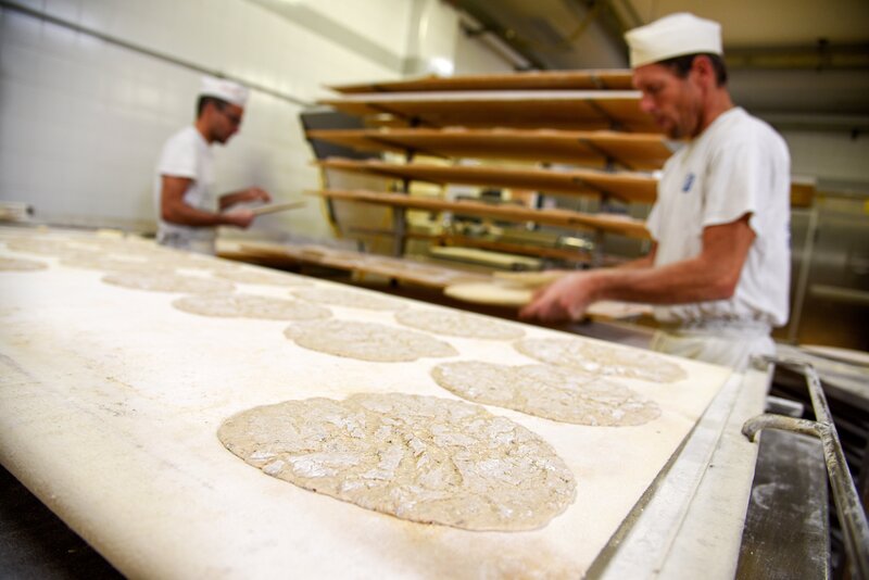 Gemeinsam mit den Mitarbeitern knetet Bäckermeisterin Barbara Schmidl in Dürnstein den Teig für die Wachauer Laberl.Bild: © ZDF und ORF/Produktion West/Gerhard Mader