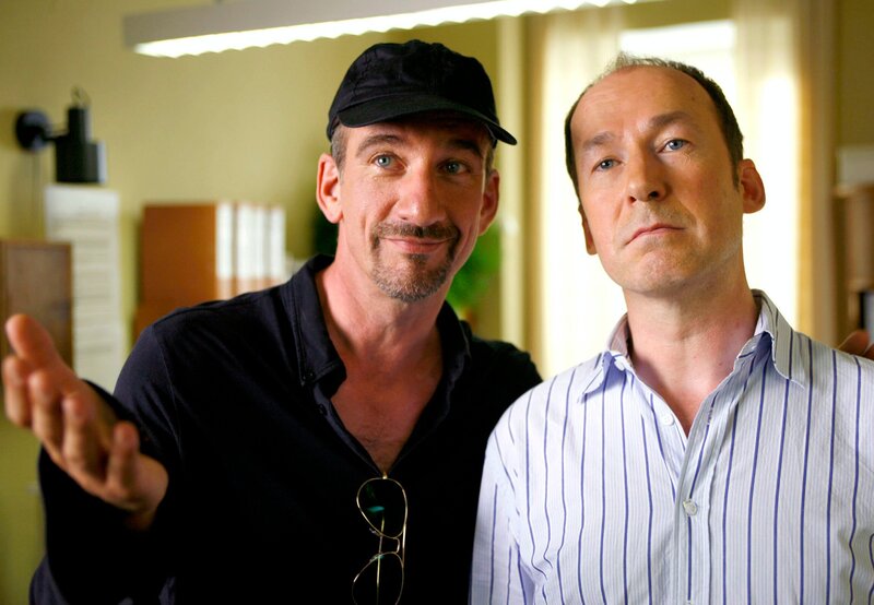 Die Ärzte Arnie (Ulrich Noethen, rechts) und Gregor (Heio von Stetten) horchen, ob der unliebsame Nachbar zu Hause ist.Bild: © rbb/Degeto/Erika Hauri