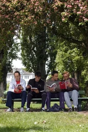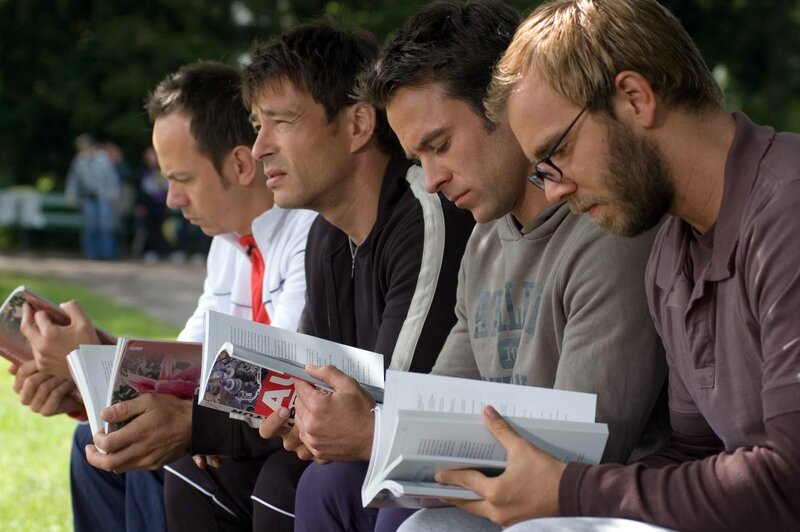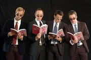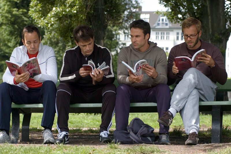 Das nennt man wahre Freundschaft! Ulf (Moritz Lindbergh, l.), Stefan (Dominic Boeer, 2.v.r.) und Karl (Jan Sosniok, r.) helfen Adam (Marco Girnth, 2.v.l.), hinter das Geheimnis eines "wahren Orgasmus'" zu kommen.Bild: © Stefan Erhard