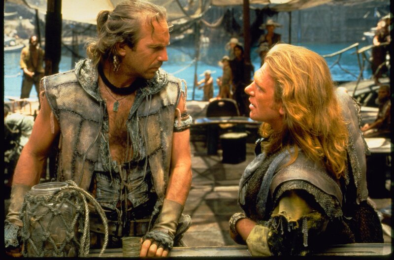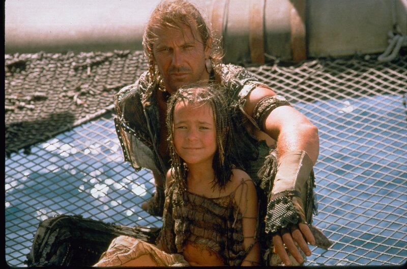 Mariner (Kevin Costner, r.) versucht Enola (Tina Majorino, l.), vor den Piraten zu beschützen. Allerdings aus reinem Eigennutz., denn Enola hat auf ihrem Rücken eine Karte, die den Weg zum einzigen noch bestehenden Fleck Erde weist ...