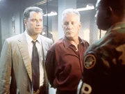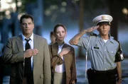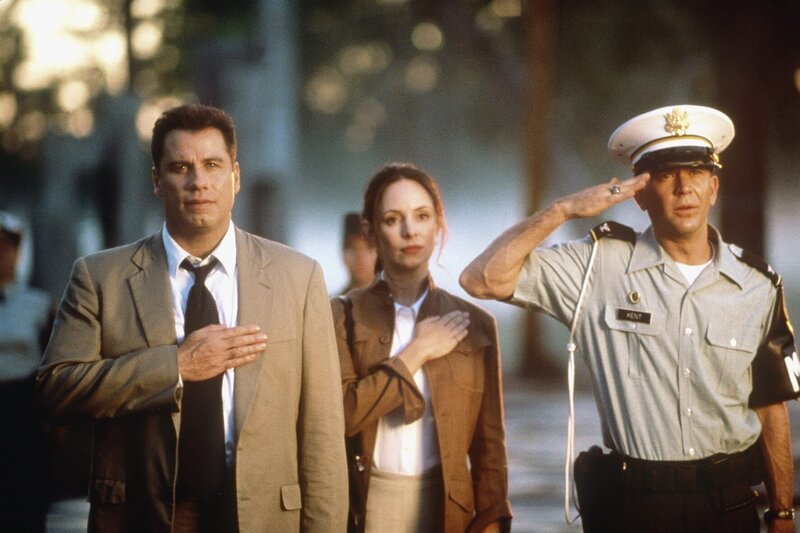 Paul Brenner (John Travolta, l.), Sara Sunhill (Madeleine Stowe, M.) und Colonel Kent (Timothy Hutton, r.) werden zur Untersuchung des Mordes an Elisabeth Campbell (Leslie Stefanson) aufgerufen.