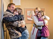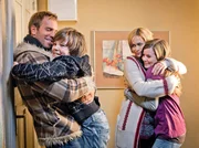 Jenny (Muriel Bielenberg, r.), Ellie Pietschek (Gesine Cukrowski) und Richy (Lasse Schiddrigkeit) freuen sich, dass Marcel (Dominic Boeer, l.) wieder da ist.Bild: © 3sat