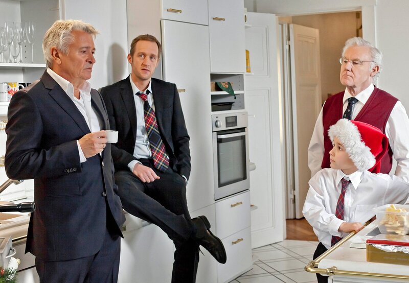 Ruprecht Welser (Henry Hübchen, l.), Leo Welser (Stephan Kampwirth, 2. v. l.), Opa Friedrich (Edgar Bessen, r.) und Nick (Jann-Piet Puddu)Bild: © ZDF/ARD Degeto/NDR/Georges Pauly