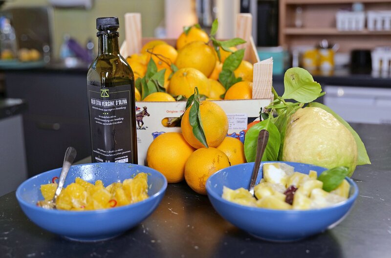 In der "weihnachtlichen Restlesküche" wird gezeigt, wie man aus Zitrusfrüchten erfrischende Salate herstellen kann.Bild: © SWR/Schwabenlandfilm GmbH / Karin Mertens
