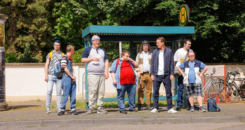 Matze (Simon Rupp), Manuel (Christian Forst), Waldemar (Matthias Sander), Michael (Jochen Riemer), TIno (Tanino Camilleri), Rudi (Jonas Relitzki), Andreas (Wotan Wilke Möhring), Ulli (Nico Michels) und Tino (Tanino Camilleri) auf dem Weg zum Spiel.