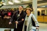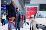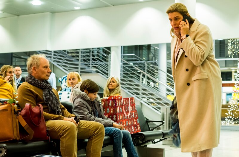 Helikopter-Mutter Jette (Elena Uhlig) und ihr Ehemann Lars (Michael Lott) sitzen mit ihrem Sohn Elias (Paul Hamm) an Heiligabend im Flughafen fest.Bild: © ARD Degeto/Gordon Mühle