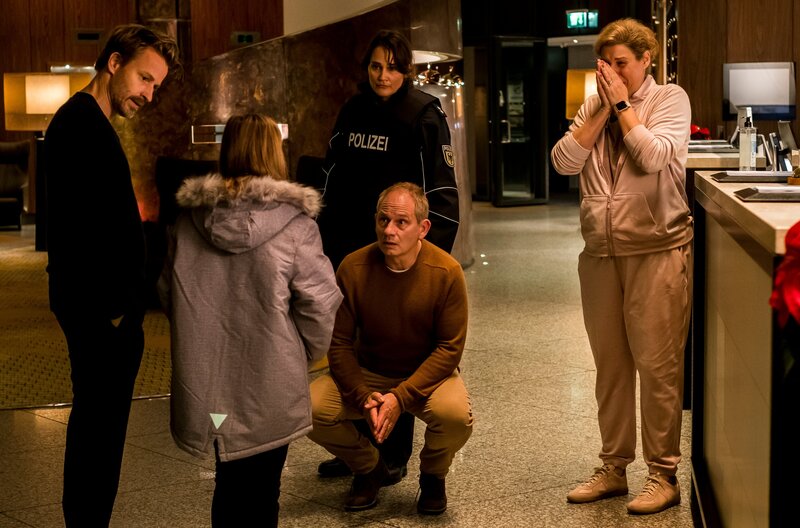 L-R: Lars Klostermann (Michael Lott), Jette Klostermann (Elena Uhlig), Christkind (Xenia Tiling), Thorsten Wenkmann (Henning Baum) und Eva Gabius (Lisa Bitter)Bild: © ORF/ARD Degeto/Gordon Mühle