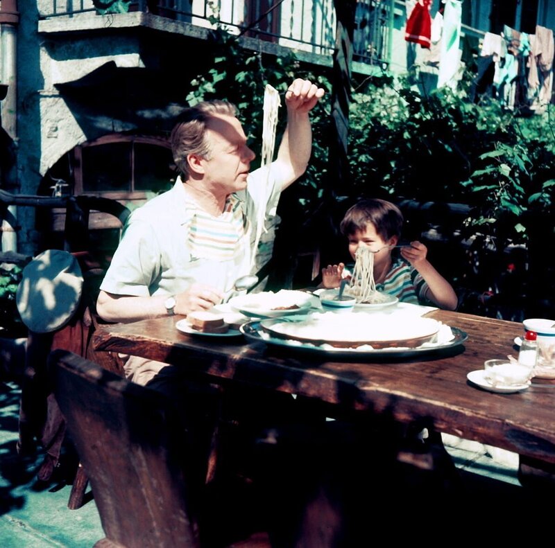 Teddy Lemke, früher ein erfolgreicher Musikclown, jetzt Besitzer eines Zauberladens, hängt an dem Pflegesohn seiner Zimmerwirtin, als ob dieser sein eigenes Kind wäre. Als man ihm den Jungen eines Tages wegnehmen will, flüchtet er mit ihm in seinem alten Artistenwagen in die Schweiz, wo die beiden sich als Clowns durchschlagen. Teddy Lemke (Heinz Rühmann) wohnt als Untermieter bei Fräulein Biermann (Fita Benkhoff). Sie hat ein Auge auf ihn geworfen, aber das interessiert ihn wenig. Umso mehr ist ihm der sechsjährige Ulli (Oliver Grimm) ans Herz gewachsen, den Fräulein Biermann in Pflege nahm, als seine Mutter Gerti (Waltraut Haas) nach Amerika ging. Ulli hält Teddy Lemke für seinen Vater, und tatsächlich könnte er sich keinen besseren Papi wünschen. Nur an Ullis Geburtstag wird Herr Lemke etwas ärgerlich, als er den Jungen in einem Kinderclown-Kostüm antrifft, das Ulli auf dem Boden gefunden hat. Später erzählt er ihm, was es damit auf sich hat. Teddy Lemke hatte einmal einen kleinen Sohn, mit dem er gemeinsam in einer erfolgreichen Musikclown-Nummer im Varietee auftrat. Als der Junge starb, gab Lemke den Artistenberuf auf und eröffnete einen Zauberladen, mit dem er jetzt sein Geld verdient. Ulli ermutigt Lemke, sich mit ihm zusammen wieder als Musikclown zu versuchen. Der Junge hat offensichtlich Talent, ein neues Engagement winkt. Ausgerechnet in dieser Situation erfährt Herr Lemke, dass Ullis Mutter ihren Sohn nach Amerika holen will, wo sie inzwischen geheiratet hat. Teddy Lemke glaubt, die Welt stürze zusammen. Er sagt Ulli kein Wort von all dem, rafft seine kleine Barschaft zusammen und flieht mit dem Jungen Hals über Kopf in seinem alten Artistenwagen in die Schweiz. Dass er gerade dort Ullis Mutter und ihrem Mann (Robert Freitag) begegnen soll, ahnt Lemke nicht … "Wenn der Vater mit dem Sohne" war ein großartiger Erfolg für Heinz Rühmann, der mit diesem Film wieder die Popularität der 1930er und 1940er Jahre erreichte, und den damals siebenjährigen Oliver Grimm. Für diese Rolle erhielt Rühmann von der Internationalen Artistenloge die "Goldene Artisten-Nadel". Die Kritik bescheinigte ihm ausgeprägtes Talent zum Clown: "Er ist am stärksten, wenn die Lausbubenstimmung mit ihm durchgeht und man nicht weiß, wer mit größerer Begeisterung Unsinn treibt - der Vater oder der Sohn". Bemerkenswert war auch Rühmanns Interpretation des Schlafliedes "La-le-lu", das zum Evergreen wurde.