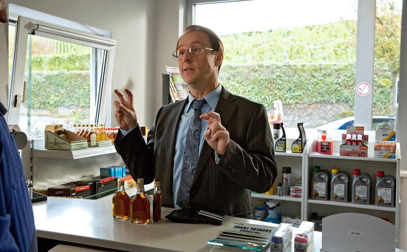 Heute wird Paul Lohmann (Bjarne Mädel) den ganz großen Auftrag an Land ziehen! In der Tankstelle spornt er sich selbst dazu an.Bild: © rbb/SWR/Volker Roloff