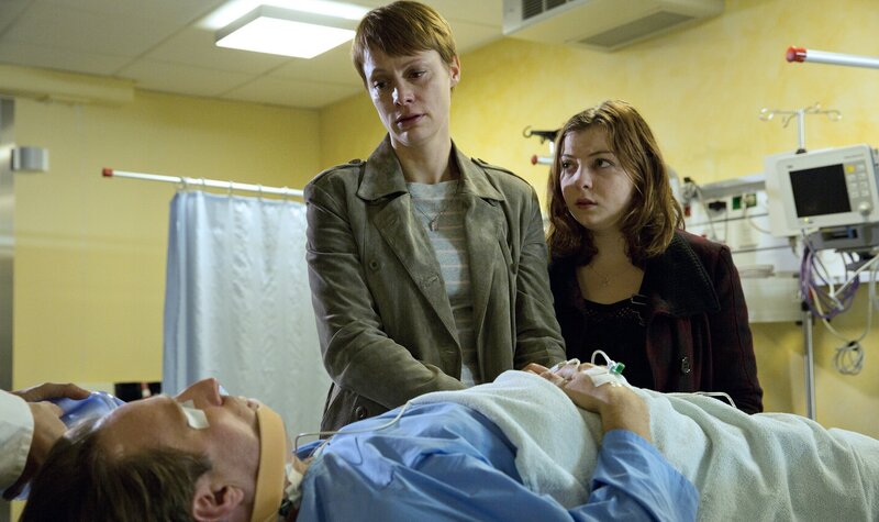 Es gibt so viel, was zwischen Edith (Katharina Marie Schubert, hinter, l.) und ihrem Mann, dem Unfallopfer Paul Lohmann (Bjarne Mädel), steht. Tochter Sonja (Amber Bongard) will sie dazu bewegen, sich an die guten Dinge zu erinnern …Bild: © PLURIMEDIA (SWR)