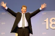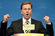 Der FDP-Vorsitzende Guido Westerwelle jubelt am Sonntag (08.09.2002) in Berlin zum Abschluss des Sonderparteitages der FDP den Delegierten zu.Bild: © WDR/picture-alliance/dpa/dpaweb/Peer Grimm