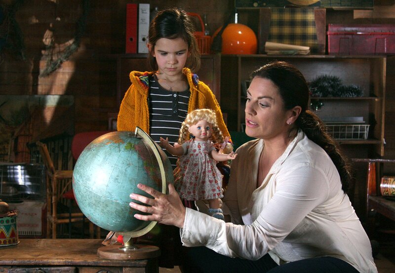 Marlen (Christine Neubauer) erklärt ihrem Adoptivkind Araceli (Lilli Geber), wo Deutschland liegt.Bild: © ARD Degeto/Michelle Bossy