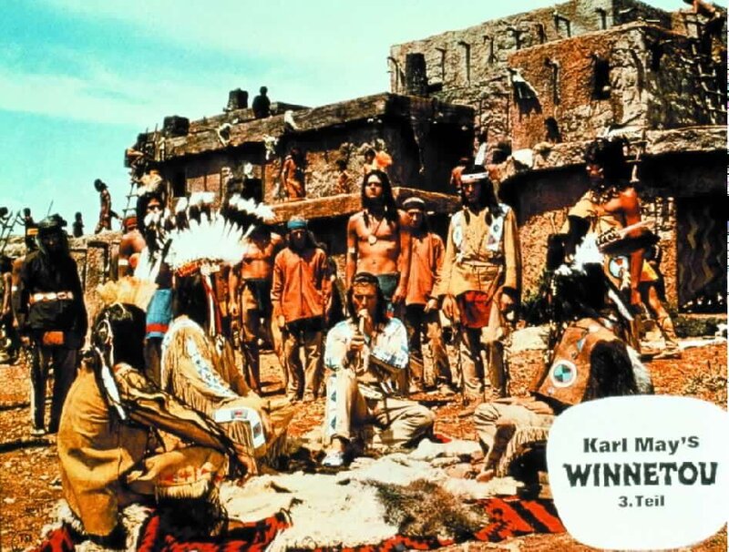 Winnetou (Pierre Brice) will mit allen Mitteln einen Krieg vermeiden. Anders der Häuptling der Jicarilla-Apachen Weißer Büffel. Nur wenn der Gouverneur von Santa Fe das an Siedler abgetretene Indianergebiet zurückgibt, bleibt es beim Frieden. Die Blutsbrüder Winnetou und Old Shatterhand (Lex Barker) versuchen zu vermitteln. Auf das Land der Jicarillas hat es jedoch der intrigante Geschäftsmann Vermeulen abgesehen. Er beauftragt den brutalen Bandenchef Rollins, den edlen Apachenhäuptling und seinen deutschstämmigen Gefährten zu töten. Doch der heimtückische Mordanschlag schlägt fehl. Old Shatterhand findet heraus, dass Vermeulen hinter dem Attentat steht. In letzter Not kann Old Shatterhand seinen Freund Winnetou vor dem Tod durch Rollins bewahren. Als der Bandit das Messer Winnetous findet, bringt Rollins damit den Sohn von Häuptling Weißer Büffel um. Die Jicarillas nehmen Winnetou und Old Shatterhand gefangen. Der Anführer der Mescalero-Apachen soll mit seinem Blutsbruder am Marterpfahl hingerichtet werden. Der dritte und letzte Teil der "Winnetou"-Trilogie ist eine der spektakulärsten und aufwendigsten Karl May-Verfilmungen. Produzent Horst Wendlandt und sein österreichischer Regisseur Harald Reinl scheuten weder Kosten noch Mühen, um die Abenteuer Winnetous (Pierre Brice) und seines Blutsbruders Old Shatterhand (Lex Barker) in Szene zu setzen. Ganze Indianerdörfer explodieren, Trecks versinken mit Ross und Wagen im Erdboden, selbst an Unterwasserszenen mangelt es nicht. Außer in Slowenien und Kroatien wurde diesmal auch in der spanischen Provinz Málaga gedreht.