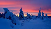 Sonnenuntergang hinter tief verschneiten Nadelbäumen.Bild: © WDR/nautilusfilm