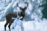 Rothirsch in tief verschneitem, winterlichen Bergwald, Allgäuer Alpen.Bild: © WDR/nautilusfilm