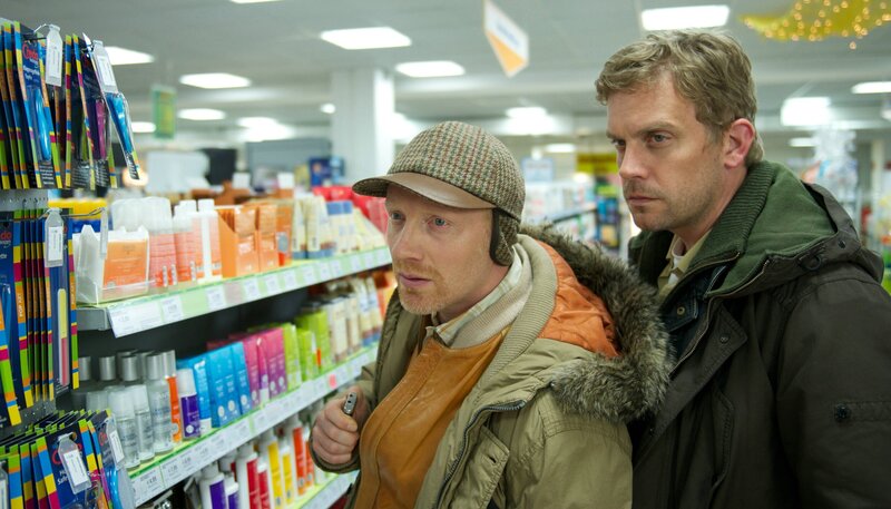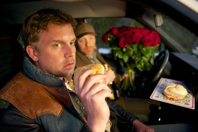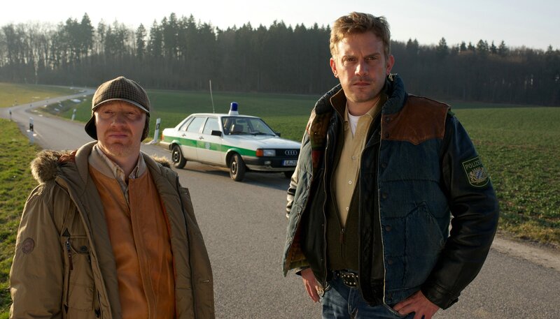 Rudi Birkenberger (Simon Schwarz, hinten) wartet auf die vermeintlich große Liebe. Franz Eberhofer (Sebastian Bezzel) begnügt sich derweil mit seinen heißgeliebten Leberkässemmeln.