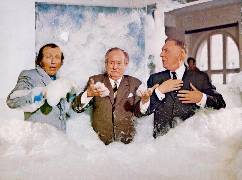 Oberstudienrat Blaumaier (Balduin Baas, li.) und Direktior Taft (Theo Lingen, re.) muessen mit einem Herrn vom Kultusministerium im Mommsen-Gymnasium ein unfreiwilliges Schaumbad nehmen. : Honorarfrei bei Nennung ARD - Filmredaktion, Frankfurt, Bertramstr. 8, Tel.: 069/ 1509378Bild: © BR/ARD-Filmredaktion