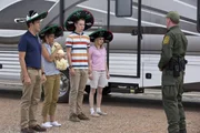 Oh shit! Kaum an der mexikanischen Grenze, da wird das Wohnmobil von David (Jason Sudeikis, l.), Rose (Jennifer Aniston, 2.v.l.), Kenny (Will Poulter, 2.v.r.) und Casey (Emma Roberts, r.) schon angehalten. Dumm nur, dass sich im Innern des Wagens zwei Tonnen Marihuana befinden ...Bild: © ORF