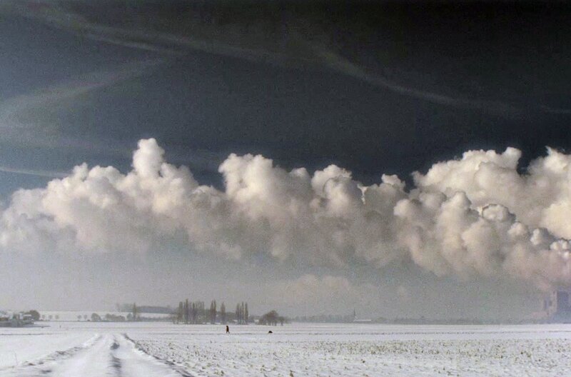 Kraftwerkswolken über dem rheinischen Braunkohlerevier: An Wintertagen kann der Ausstoß den Hochnebel vertreiben oder sich sogar in Eiskristalle verwandeln.Bild: © Hannes Lang/Petrolio Film