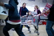 In einem bereits geplünderten Supermarkt außerhalb der Stadt versuchen Gerry (Brad Pitt, l.), Karen (Mireille Enos, r.) und Tochter Constance (Sterling Jerins, M.) - wie viele andere -, noch Lebensmittel aufzutreiben.