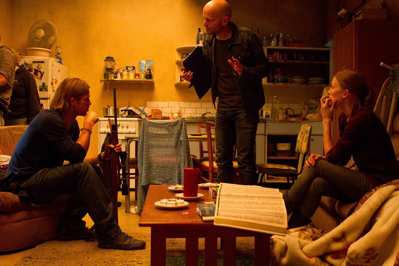 Sie konnten sich gerade so in ein Wohnhaus flüchten, draußen toben Zombies und jetzt wird es auch bei ihnen gefährlich. Gerry (Brad Pitt, vorne) und seine Ehefrau Karin (Mireille, hinten) sind auf der Hut ...