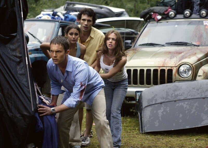 Eigentlich wollten (v.l.n.r.) Chris (Desmond Harrington, M.), Carly (Emmanuelle Chriqui), Scott (Jeremy Sisto) und Jessie (Eliza Dushku) ein ruhiges Wochenende beim Camping verbringen, doch ein über die Fahrbahn gespannter Stacheldraht unterbricht dieses Vorhaben.Bild: © ProSieben Fun