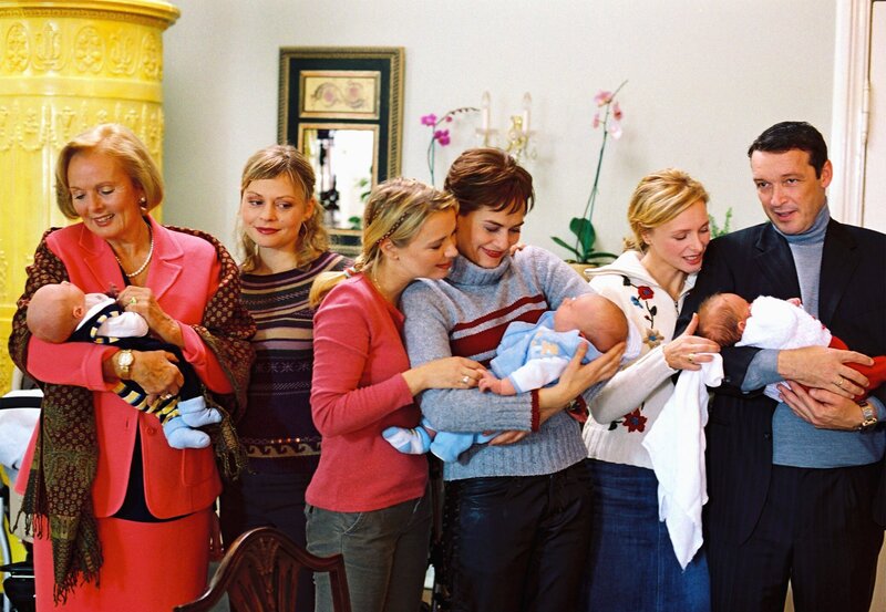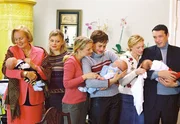 Hildegard Reimund (Ruth Maria Kubitschek, li.) ist überglücklich: Ihre Töchter Susanne (Susanna Simon, 2.v.li.), Anja (Tina Ruland, 3.v.li.) und Regina (Marita Marschall, 2.v.re.) haben ihr fast zur gleichen Zeit ein Enkelkind geschenkt. Schwiegersohn Robert (Michael Roll) und Anjas Freundin Karin (Gesine Cukrowski) waren auch irgendwie beteiligt.Bild: © ARD Degeto/Katrin Knoke