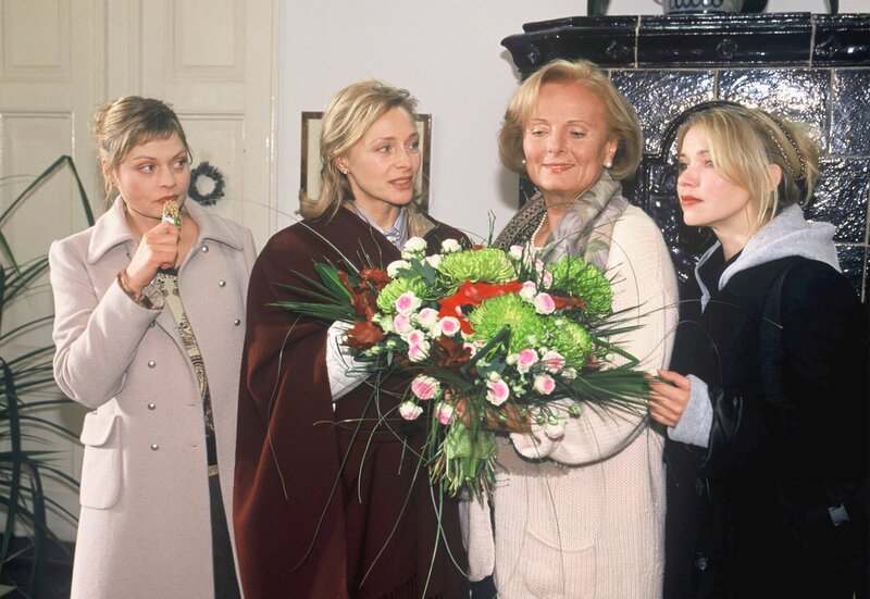 Hildegard Reimund (Ruth Maria Kubitschek, 2.v.re.), eine wohlhabende ältere Dame, wünscht sich ein Enkelkind. Ihre drei Töchter Susanne (Susanna Simon, li.), Anja (Tina Ruland, re.) und Regina (Marita Marschall) haben jedoch andere Familienpläne.
