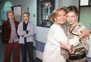 Hildegard Reimund (Ruth Maria Kubitschek, 2. von rechts) umarmt ihre jüngste Tochter Susanne (Susanna Simon, rechts), die ihr ein Enkelkind schenkt. Anja (Tina Ruland, 2. von links.) und Regina (Marita Marschall) sind nicht begeistert.Bild: © WDR/Degeto/Katrin Knoke