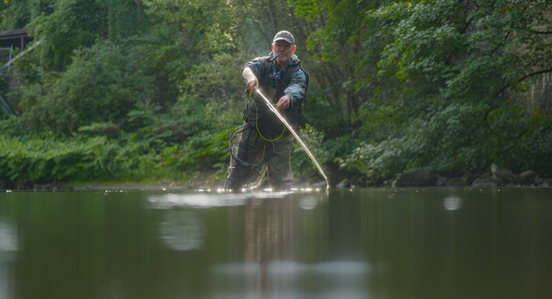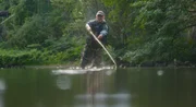 Einmal im Leben durch Wuppertal schweben! Die Wuppertaler Schwebebahn feiert ihren 125. Geburtstag - ein "einzigartiges" Verkehrsmittel in einer besonderen Stadt. - Elmar Weber ist Wupperpate. Hier, mitten im Stadtgebiet, angelt er mittlerweile wieder Forellen und Eschen.Bild: © WDR/Jörg Adams / WDR Kommunikation/Redaktion Bild