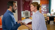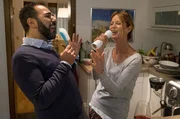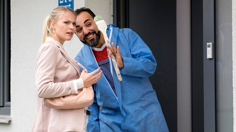Kenan (Adnan Maral) ist nicht ganz unschuldig, dass es bei Lissi (Esther Schweins) gebrannt hat. Nun bietet er seiner Nachbarin Unterschlupf in seinem Haus an.Bild: © ARD Degeto/Erika Hauri