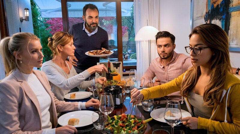 Kenan (Adnan Maral, 3. v. li.) und Lissi (Esther Schweins, 2. v. li.) laden ihre Kinder ein. Aysel (Gizem Emre, re.), Can (Aram Arami) und Sofie (Jeanne Goursaud, li.) haben aber wenig Lust auf Patchwork.Bild: © ARD Degeto/Erika Hauri