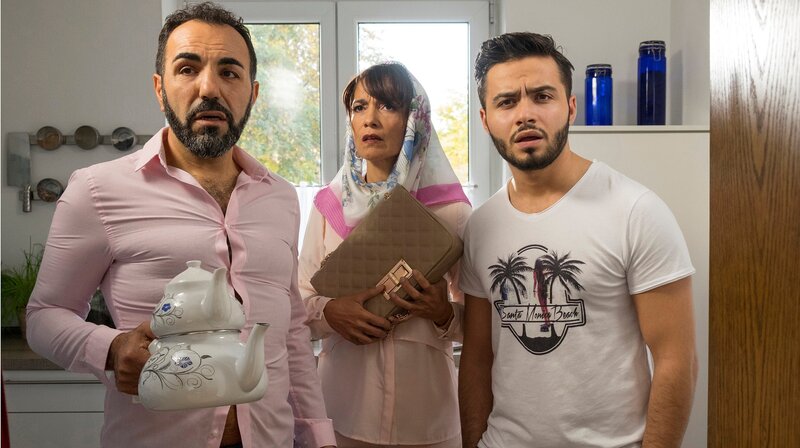 Die flippige Lissi (Esther Schweins) bringt alle zum Staunen: Kenan (Adnan Maral) mit Sohn Can (Aram Arami, re.), und Gül (Berivan Kaya).Bild: © ARD Degeto/Erika Hauri