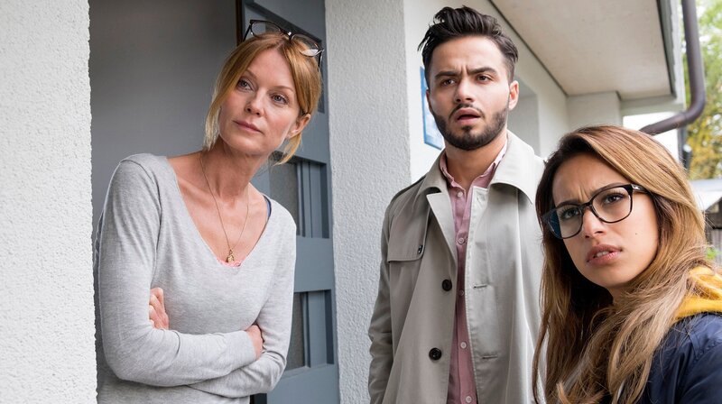 Eigentlich wollen Aysel (Gizem Emre, re.) und Can (Aram Arami) zu ihrem Vater und wundern sich, dass Nachbarin Lissi (Esther Schweins) die Türe öffnet.Bild: © ARD Degeto/Erika Hauri