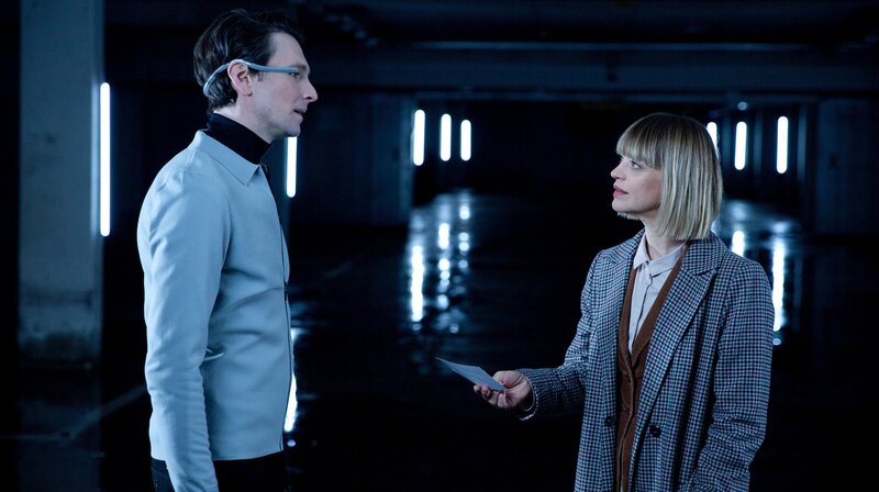 Cynthia (Heike Makatsch) unterbricht die Präsentation der neuen Act App und stellt dem Freemee-Chef Carl Montik (Sabin Tambrea) kritische Fragen zu seinen tatsächlichen Motiven.Bild: © WDR/Volker Roloff
