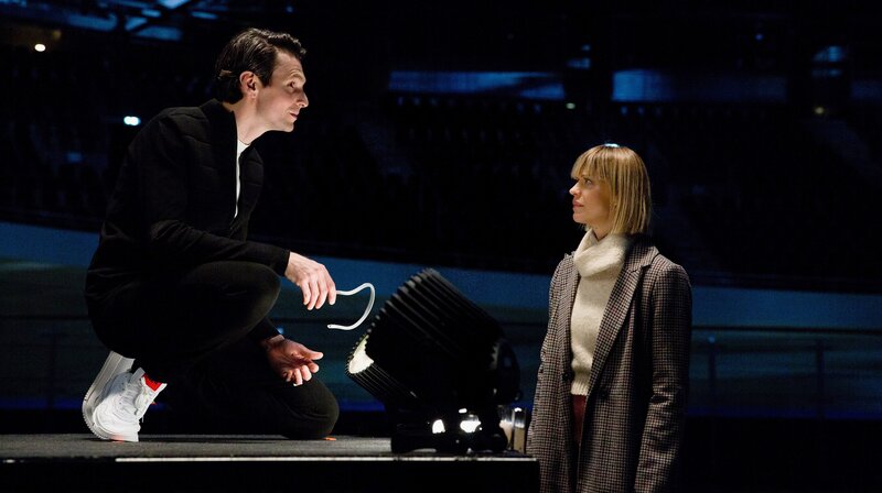 Cynthia (Heike Makatsch, l) und der Avatar ihres verstorbenen Mannes Philipp (Fabian Joest Passamonte).Bild: © WDR/Volker Roloff