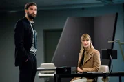 Cynthia (Heike Makatsch) in der Höhle des Löwen: Freemee-Chef Carl Montik (Sabin Tambrea) stellt sich der kritischen Journalistin in der Freemee-Zentrale.Bild: © WDR/Volker Roloff