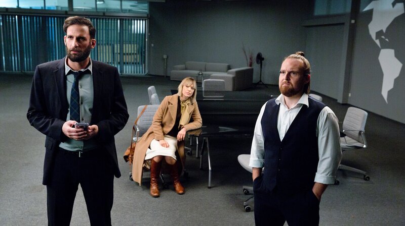 Geoff (Matthias Weidenhöfer, l) und Tony (Axel Stein) vom Online-Magazin „Daily“ verfolgen zusammen mit Cynthia (Heike Makatsch) den Live-Stream der ZERO-Attacke im Innenministerium.Bild: © WDR/Volker Roloff