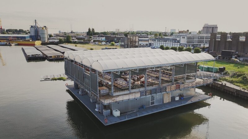 In Rotterdam leben und grasen bereits dutzende Kühe auf einer "Floating Farm" auf dem Wasser.Bild: © ZDF und Xavier Marquis