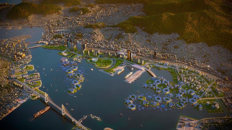 Mit Hilfe der Vereinten Nationen plant das Unternehmen Oceanix vor der Küste von Busan in Südkorea den Bau einer schwimmenden Stadt.Bild: © ZDF und Xavier Marquis
