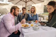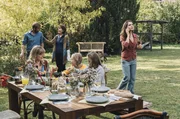 Katharina (Henriette Richter-Röhl) muss mal wieder telefonieren, während ihr Freund Mike (Jochen Matschke), ihre Mutter Johanna (Thekla Carola Wied (hinten), ihre Schwester Jana (Christiane Bärwald) und Nichten Marlene (Lilli von Hehn, am Tisch rechts) und Greta (Lynn Kremer, am Tisch Mitte) das Zusammensein genießen.