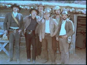 L-R: News Carver (Timothy Scott), The Sundance Kid (Robert Redford), Harvey Logan (Ted Cassidy), Butch Cassidy (Paul Newman), Gunman (Dave Dunlop), Flat Nose Curry (Charles Dierkop).Bild: © Kabel Eins Classics
