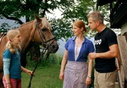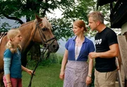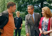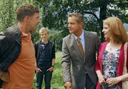 Martin (Sascha Hehn, li.) ahnt, dass der "Schriftsteller" Alexander (Florian Fitz, 2.v.re.) die arglose Bettina (Julia Jäger) und ihren Sohn Tom (Paul Metzger) um ihren Hof bringen will.