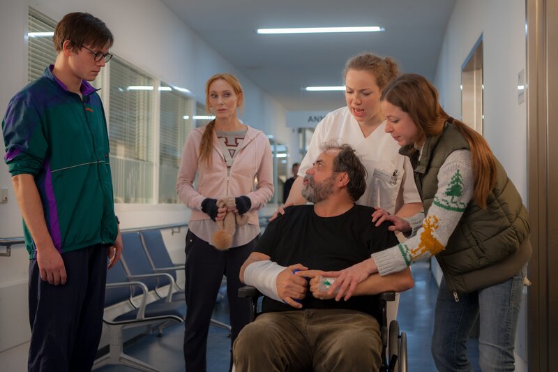 Hans (Matthias Brenner, sitzend) beschimpft Thaddäus (Franz Hartwig, l.) und wirft ihm vor, mit seinem Ladendiebstahl schuld am Unfall gewesen zu sein. Pflegerin Peggy (Julia Jendroßek, 2.v.r.) und seine Tochter Isabelle (Sandra von Ruffin, r.) versuchen ihn zu beruhigen, während Rebecca (Andrea Sawatzki, 2.v.l.) still aus dem Hintergrund beobachtet.