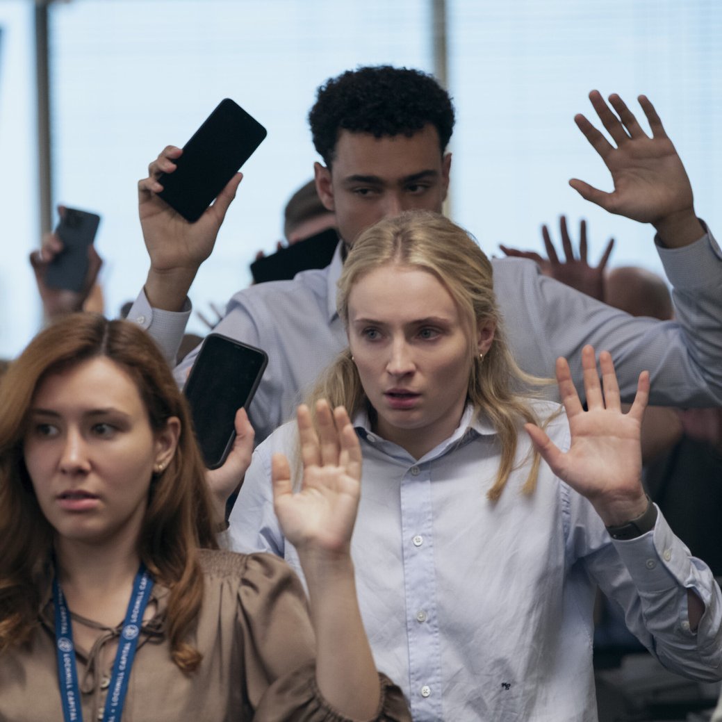 Zitternde Hände, leises Schluchzen, gerötete Augen - allein schon die Reaktionen der Mitarbeitenden, die an dem Ort, an dem sie eine Geiselnahme wohl am wenigsten vermuten, überzeugen emotional. Auch Sophie Turner glänzt in ihrer Darstellung, vor allem, da zu diesem Zeitpunkt genau genommen nichts über sie als Hauptfigur bekannt ist. Dafür spricht ihr Verhalten für sich: Zuerst opfert sie sich für Myrtle, die sich bei einem Aufruf der Geiselnehmer meldet. Dann unterstützt sie Luke, der kurz vor einem Nervenzusammenbruch steht. Schließlich nimmt sie den Anruf der Bank entgegen und gibt die Transaktion in Milliardenhöhe frei. Doch ist sie wirklich eine Heldin oder gehört das alles bloß zum Plan?